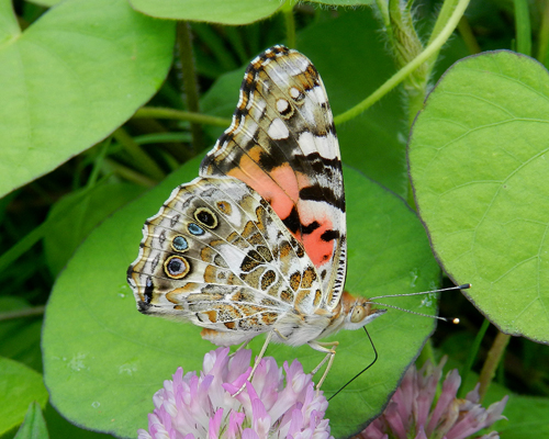 Ventral view. The hindwing has four smaller eye spots. In contrast, the American Lady has two large eye spots.